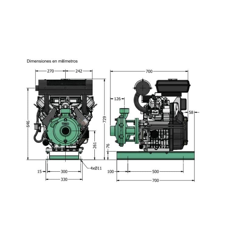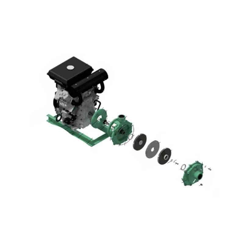 Bomba de alta presión marca Barnes accionada por motor diésel de 27 Hp. Alcanza un flujo hidráulico de 50 GPM a una presión de 110 MCA con cuerpo de hierro fundido. Potente y robusta para labores de emergencia y riego agrícola.