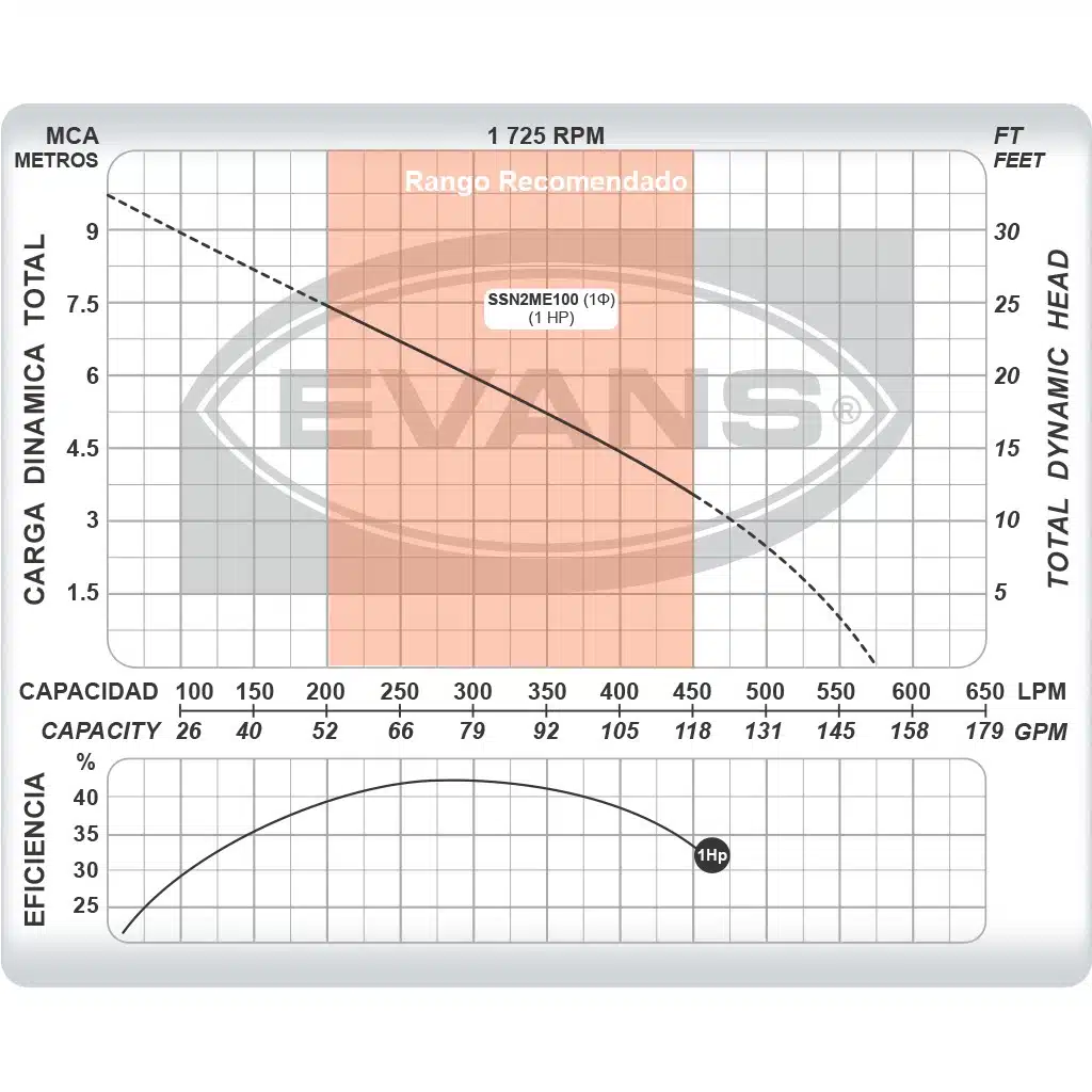 Bomba Evans | Sumergible | 1 Hp | 110 Vac | Hierro | D. 2″ | Monofásico | 6 MCA / 79 GPM | SSN2ME100 |