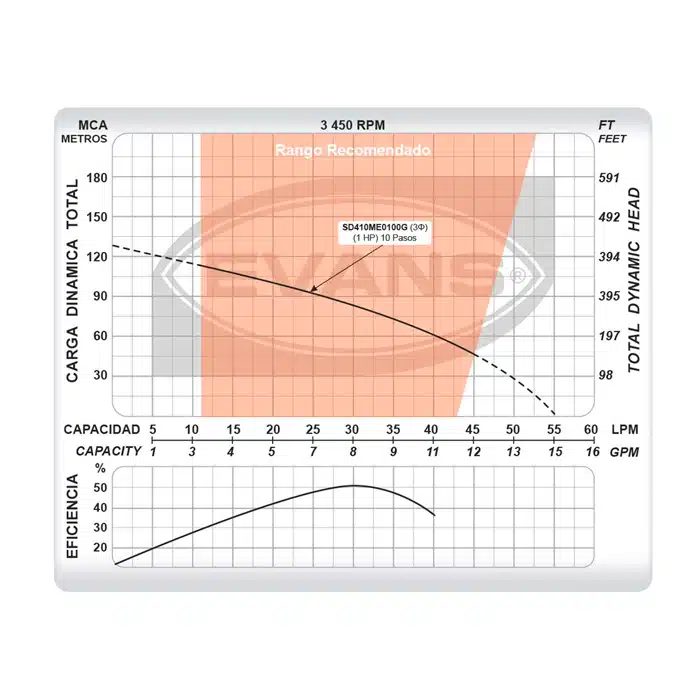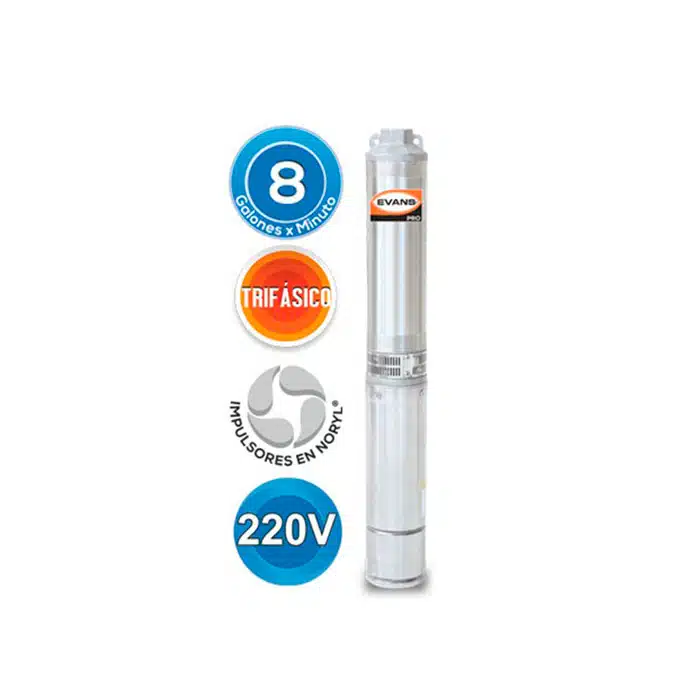Bomba Evans | Sumergible – Pozo profundo | 1 Hp | 220 V | 10 Etapas | Acero Inox. | D. 1¼» | Trifásica | 80 MCA / 8 GPM | SD410ME0100G