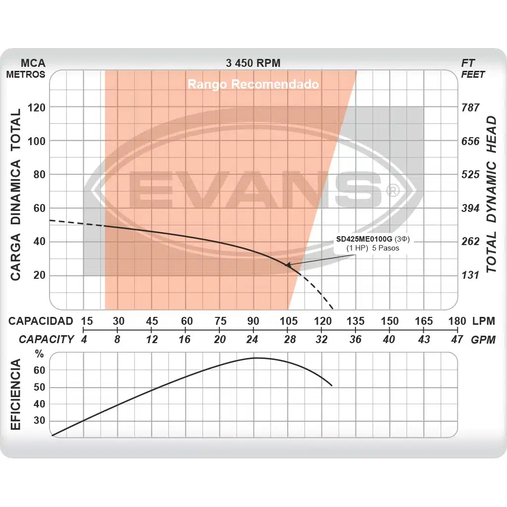 Bomba Evans | Sumergible – Pozo profundo | 1 Hp | 220 V | 5 Etapas | Acero Inox. | D. 2″ | Trifásica | 28 MCA / 25 GPM | SD425ME0100G