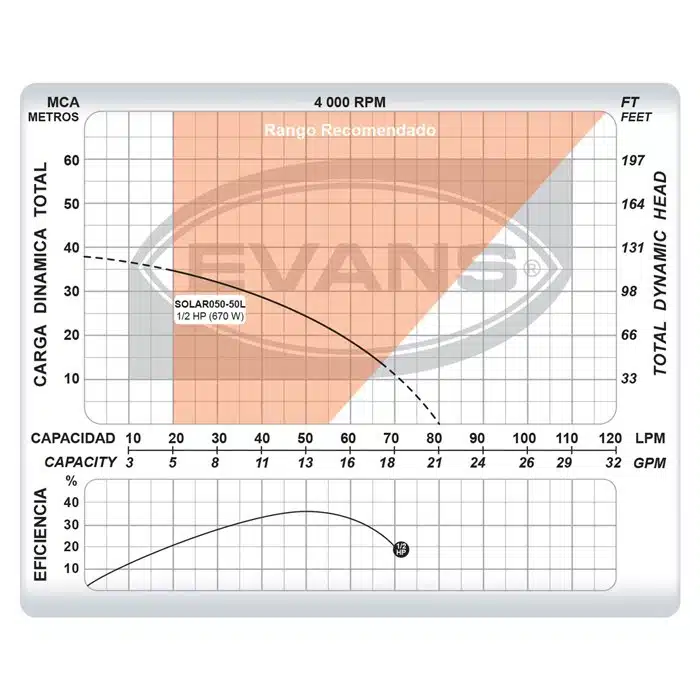 Bomba Solar Evans | Sumergible 3″ | 0,5 Hp | (40 – 96) VCD | 5 Etapas | D. 1¼» | Acero Inox. | 24,5 MCA / 13 GPM | 670 Watt | SOLAR050-50L