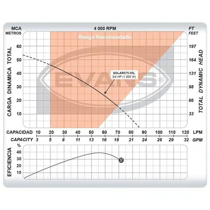 Bomba Solar Evans | Sumergible 3″ | 0,75 Hp | (60 – 150) VCD | 7 Etapas | D. 1¼» | Acero Inox. | 26 MCA / 14,5 HP | 1005 Watt | SOLAR075-55L