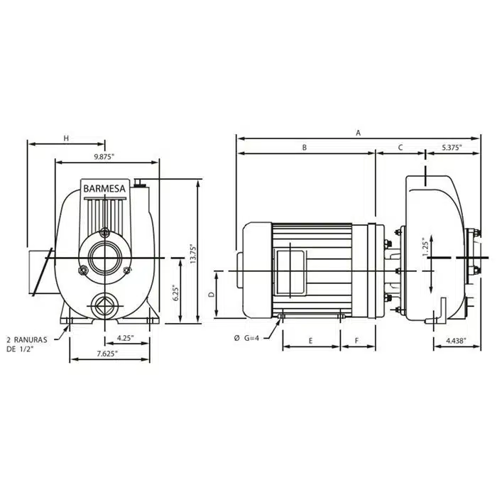 Electrobomba autocebante hídrica marca Barmesa de 7.5 Hp monofásica (220 Vac). Proporciona un flujo de 106 GPM a una presión de 28 MCA. Estructura de hierro diseñada para gestión de agua limpia comercial eficiente.