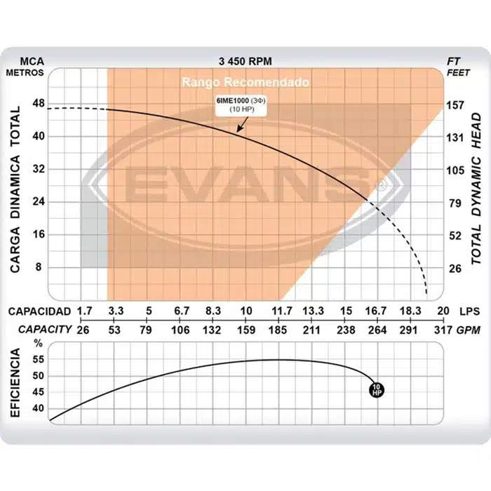 Electrobomba Evans | Centrífuga | 10 Hp | 220/440 V | Trifásico | Hierro | SxD 3″ x 2″ | 36 MCA / 185 GPM | 6IME1000