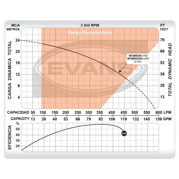 Electrobomba Evans | Centrífuga | Alto flujo | 2 Hp | 110/220 V | Monofásico | Hierro | SxD 2″ x 2″ | 16 MCA / 92 GPM | MT2ME200