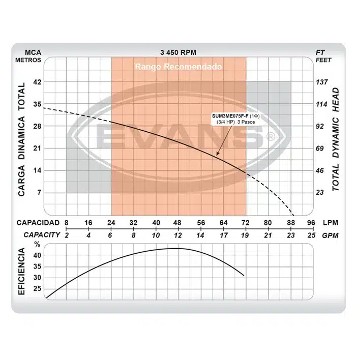 Electrobomba Evans | Sumergible | 0,75 Hp | 110 V | 3 Etapas | Monofásico | Plástico | D. 1″ | 23 MCA / 12 GPM | SUM3ME075F-F