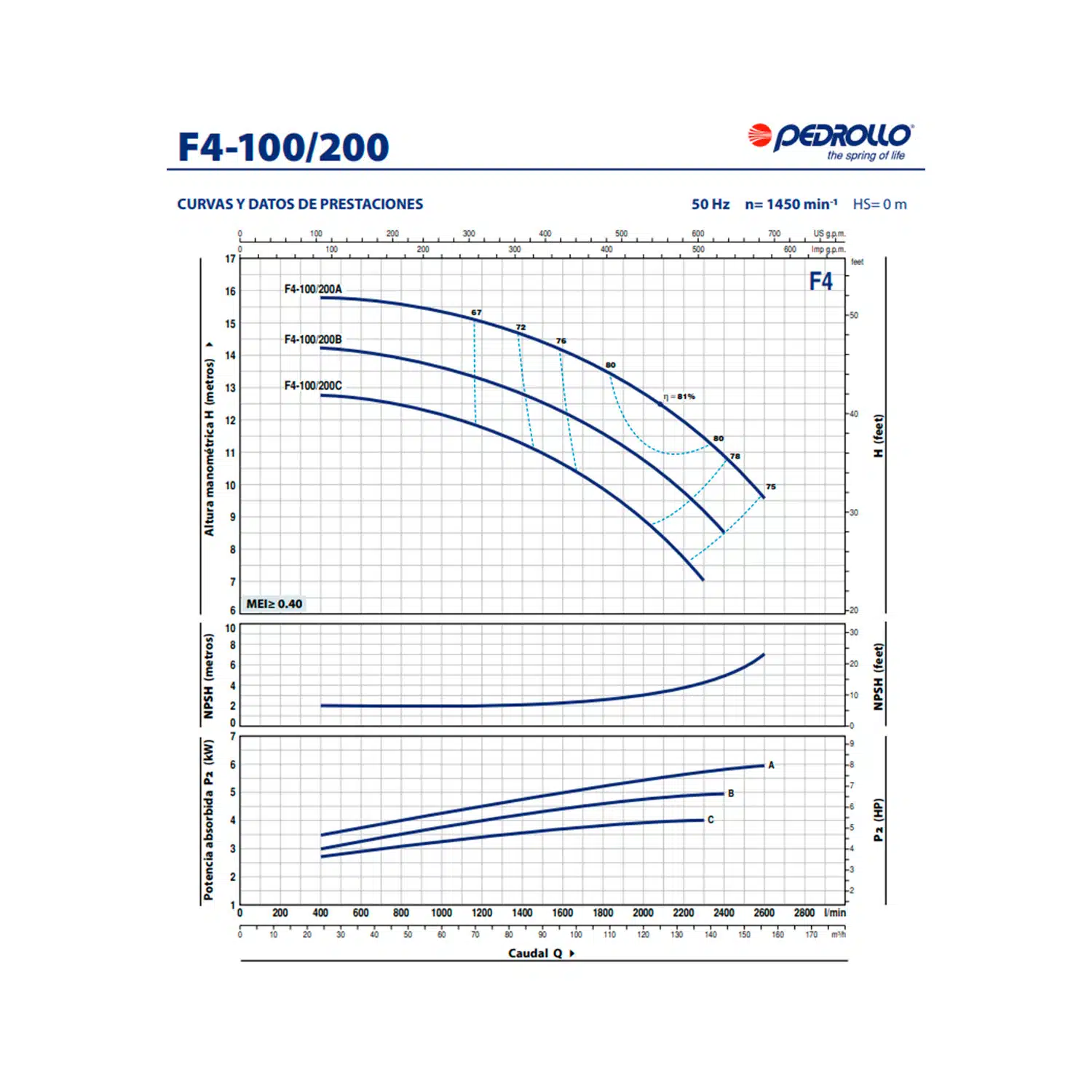 Electrobomba Pedrollo | Centrífugas Normalizadas «733» | Hierro | 220/440 Vac | 7.5 Hp | SxD 5″-4″ | Trifásico | 4 Polos | 14.6 MCA / 370 GPM | 1-4-100 | F4-100/200A |