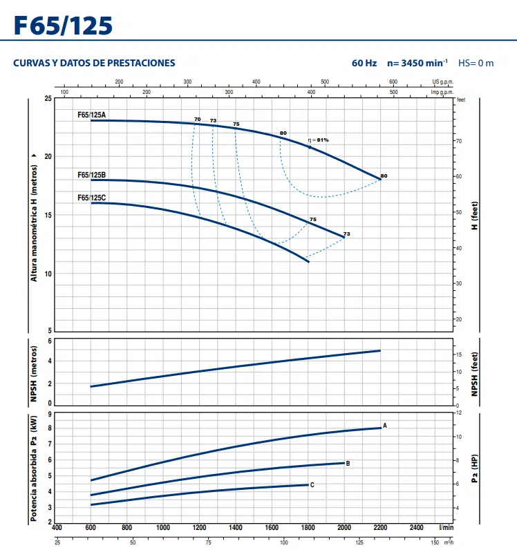 Electrobomba Pedrollo | Centrífugas Normalizadas «733» | Hierro | 220/440 Vac | 7,5 Hp | SxD 3″-2½» | Trifásico | 17 MCA / 317 GPM | F65/125B | 1-4-72