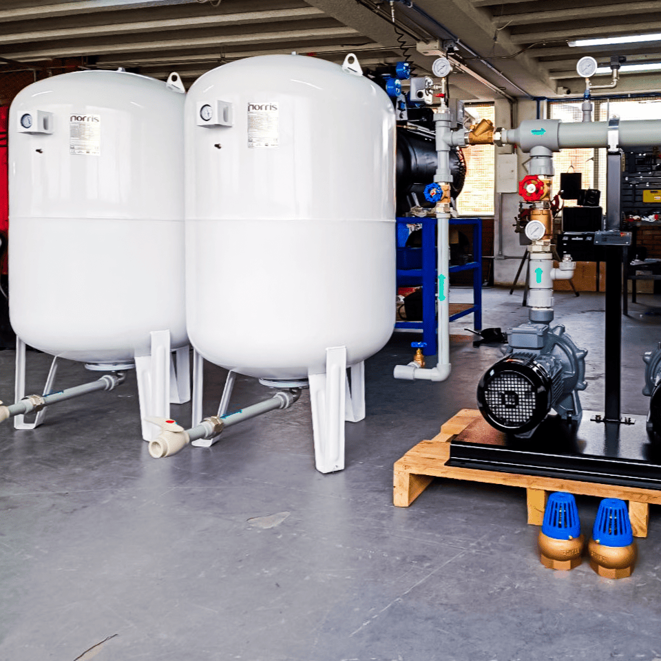 Tanques tipo membrana que acumulan agua bajo presión, amortiguan los arranques de las bombas y mantienen presión constante en la red, optimizando el consumo energético y prolongando la vida útil del equipo.